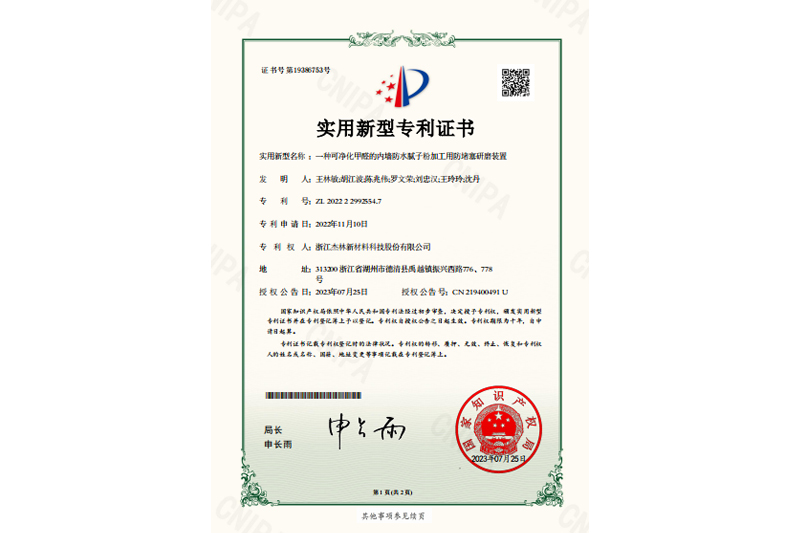 • 一種可凈化甲醛的內墻防水膩子粉加工用防堵塞研磨裝置-證書